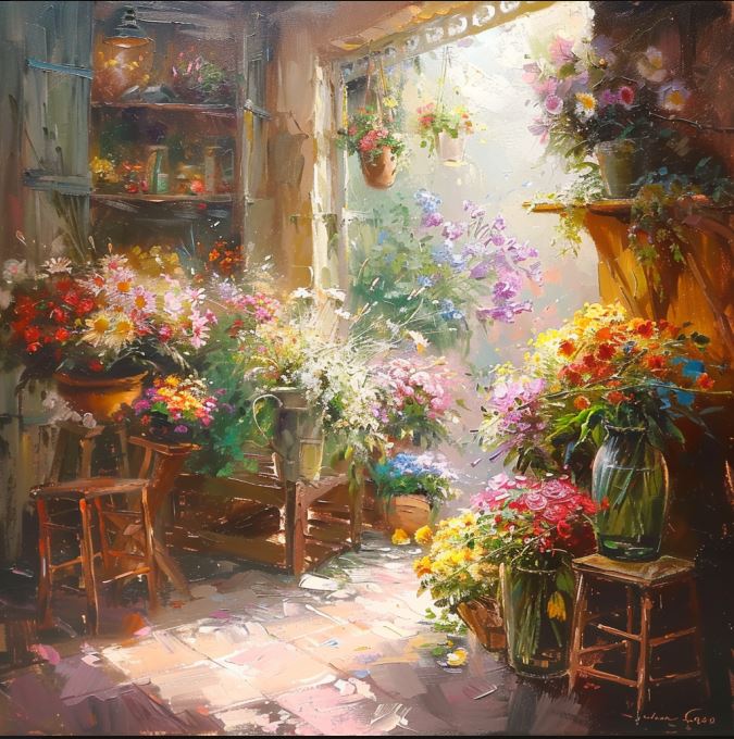 찰스는 강가를 따라 걷다가 레일라의 꽃집으로 향했다. 가게 문을 열고 들어서자, 각종 꽃들의 향기가 그를 맞이했다. 레일라는 미소를 지으며 찰스를 반겼고, 그들은 곧 진지한 대화에 빠졌다.