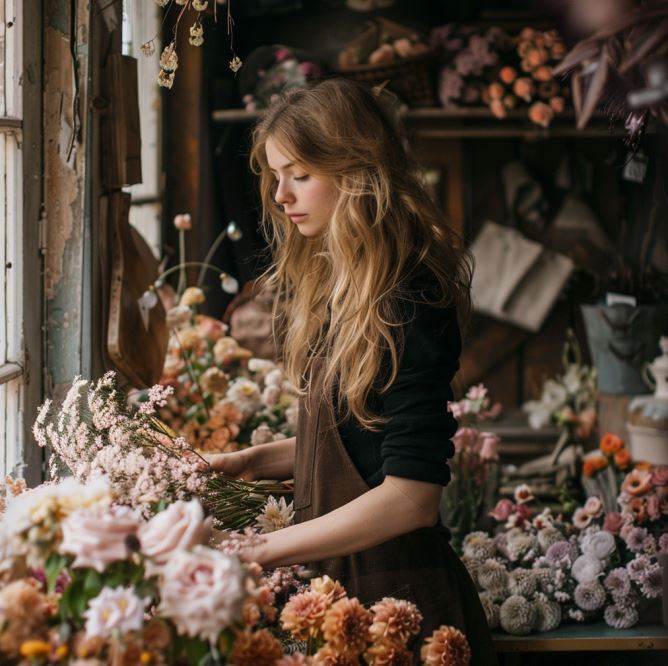 꽃집 안으로 들어서자, 레일라는 바쁘게 움직이며 꽃들을 정리하고 있었습니다. 그녀의 손길은 부드럽고 정교했으며, 꽃들은 그녀의 손 아래에서 더욱 아름답게 피어나는 듯했습니다. 찰스는 그녀의 모습을 보며 잠시 모든 걱정을 잊었습니다.