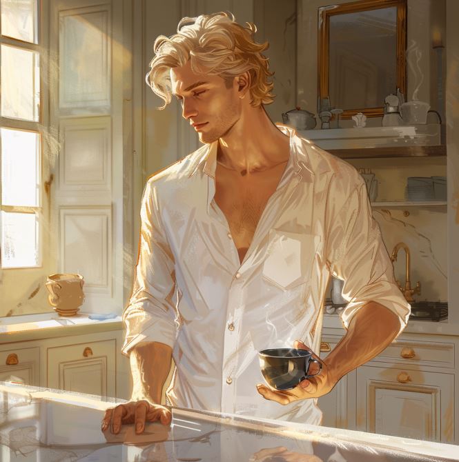 프랑스 파리의 이른 아침, 찰스는 새하얀 셔츠의 소매를 걷으며 커피를 내렸다. 햇살이 주방의 대리석 카운터 위에 부드러운 금빛으로 빛나고, 외부의 시끄러운 도시 소음과는 대조적으로 그의 아파트는 평화로웠다. 그의 금발은 약간의 곱슬거림을 띄며 자연스럽게 흘러내렸고, 그가 커피를 한 모금 마실 때마다 담배 연기가 희미하게 공간을 메웠다.