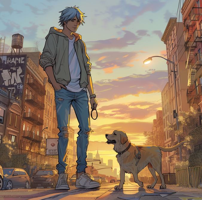서늘한 가을 아침, 해질 녘에 물든 도시의 스카이라인이 연한 하늘색 머리카락의 애런과 그의 금발 골든 리트리버, 루키의 실루엣을 아련하게 비추었다. 뉴욕의 번화가를 걷는 애런은 이른 아침의 서늘함을 견딜 수 있는 슬림한 청바지와 넉넉한 사이즈의 회색 후디를 입고 있었다. 그의 긴 다리는 그늘진 거리를 거닐 때마다 마치 패션쇼의 런웨이를 밟는 듯 했다.