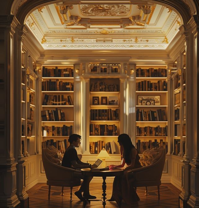 밤이 깊어가는 가운데, 아리아나는 서재로 이끌었다. 서재는 옅은 금색 조명으로 비춰져 따뜻한 분위기를 자아내며, 두 사람은 자리를 잡고 앉았다. 아리아나가 손짓으로 서재 한쪽에 위치한 향수 컬렉션을 가리켰다. 각별한 취미로, 그녀는 세계 각지의 향수를 수집해왔다.