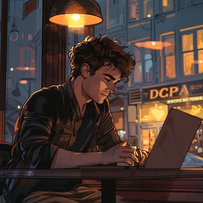 뉴욕의 한 북적이는 카페에서, 데이브는 피곤한 눈으로 노트북 화면을 바라보고 있었다. 밖은 어둑어둑해지기 시작했고, 가게 안의 조명은 탁자 위에 놓인 커피잔들을 금빛으로 비추고 있었다. 데이브의 연한 갈색 숏컷은 빛나는 조명 아래에서는 더욱 진하게 보였다. 그는 연한 청바지와 검은색 셔츠를 입고 있었으며, 그의 운동화는 약간 먼지가 쌓인 듯 보였다.