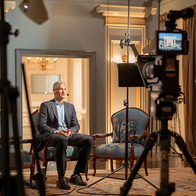 오늘 제임스가 진행할 프로그램은 '지속 가능한 투자와 장기적 자산 성장 전략'에 관한 것이었습니다. 스튜디오는 따뜻한 조명과 부드러운 베이지 색의 배경, 그리고 세련된 블루와 그레이 색상의 장식으로 고급스러움을 더했습니다. 카메라가 켜지고, 제임스는 자신의 자리에 앉아 청중을 향해 미소를 지으며 말을 시작했습니다.
