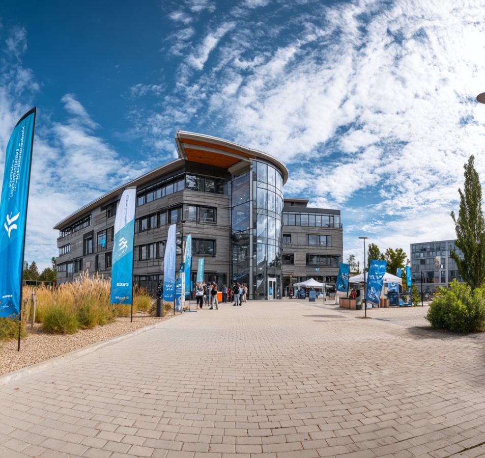 지역 창업 캠퍼스를 배경으로 한 파노라마 뷰, 청년들이 건물로 들어가는 모습, 지역 혁신과 창업을 홍보하는 배너, 푸른 하늘과 자연색을 강조한 실사 스타일