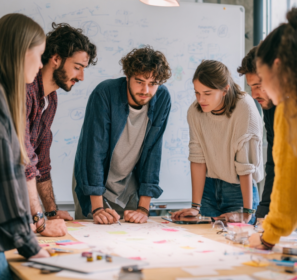 밝은 사무실에서 협업 중인 성공한 청년 스타트업 팀, 다양한 배경의 청년들이 테이블에 모여 아이디어 회의 중, 화이트보드에 가득한 다이어그램, 자연광이 들어오는 실사 스타일
