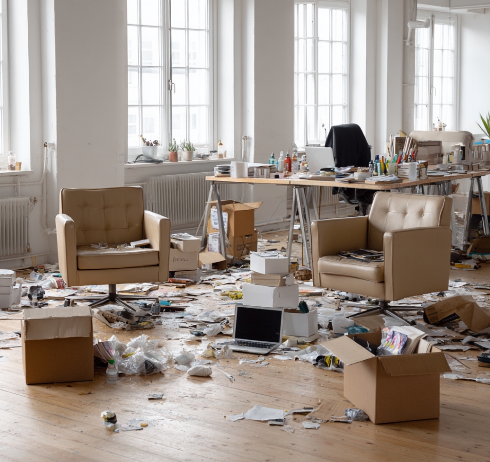 본문 3 중후반 - 창업 실패의 현실, 정책 의존적 창업의 부작용을 설명할 때, 실제 폐업한 창업 공간을 연상시키는 이미지로 독자의 몰입을 유도합니다.