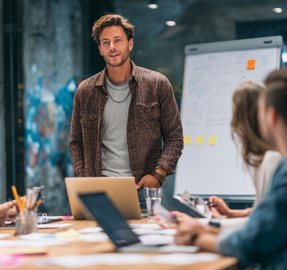 현대적인 공유 오피스에서 창업 아이디어를 발표하는 청년 창업가, 자신감 있는 분위기, 비즈니스 캐주얼 복장, 노트북과 발표 자료가 책상 위에 있는 고해상도 실사 스타일