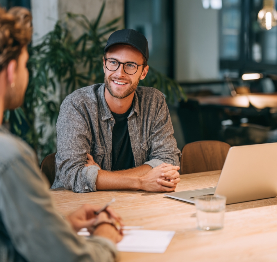 현대적인 아늑한 공간에서 멘토가 청년 창업가에게 조언하는 장면, 실제 대면 미팅, 부드러운 자연광이 들어오는 실사 스타일의 멘토링 장면